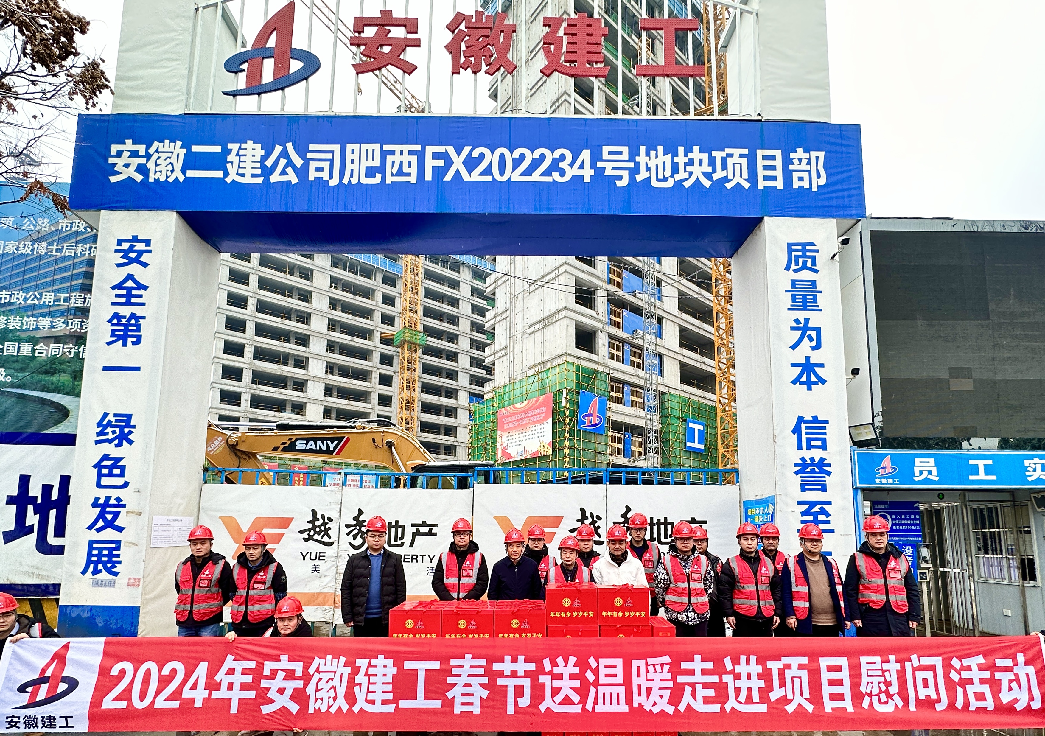 在二建肥西FX202234號地塊項目部,徐文聯帶隊開展了2024年安徽建工春節“送溫暖”走進項目部慰問活動,向堅守一線崗位的項目管理人員和工人派發節日慰問品,對大家一年以來的辛苦工作表示感謝,并送上新春誠摯的祝福和問候。