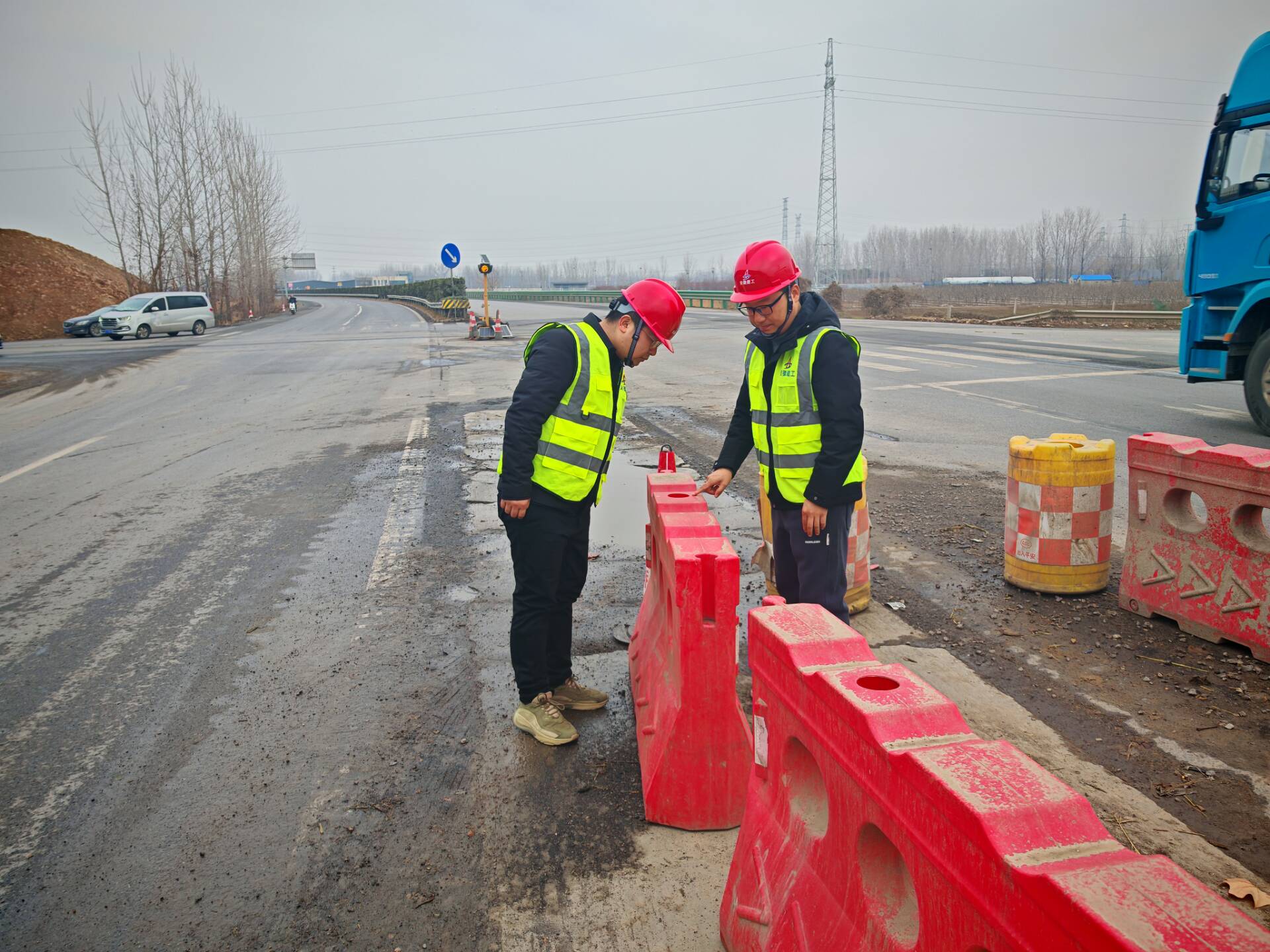 徐淮阜交安機電綠化工程項目技術負責人張楠楠和核算員鄭全勝正在進行涉路道口安全檢查