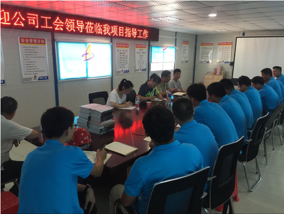 李主席一行到達施工現場,參觀了工地,仔細詢問了項目概況以及目前施工進度、質量、安全等方面情況,聽取了項目工會主席創建“工人先鋒號”匯報,對項目班子以“一流工作、一流服務、一流業績、一流團隊”為目標的創建活動給予了肯定,鼓勵項目部繼續完善,爭創集團“工人先鋒號”工程。