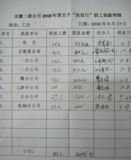 在10月17日全國第五個“扶貧日”即將到來之際,安徽二建公司積極響應集團公司號召,繼續在全體職工中開展向集團對口幫扶貧困鄉村捐款活動。