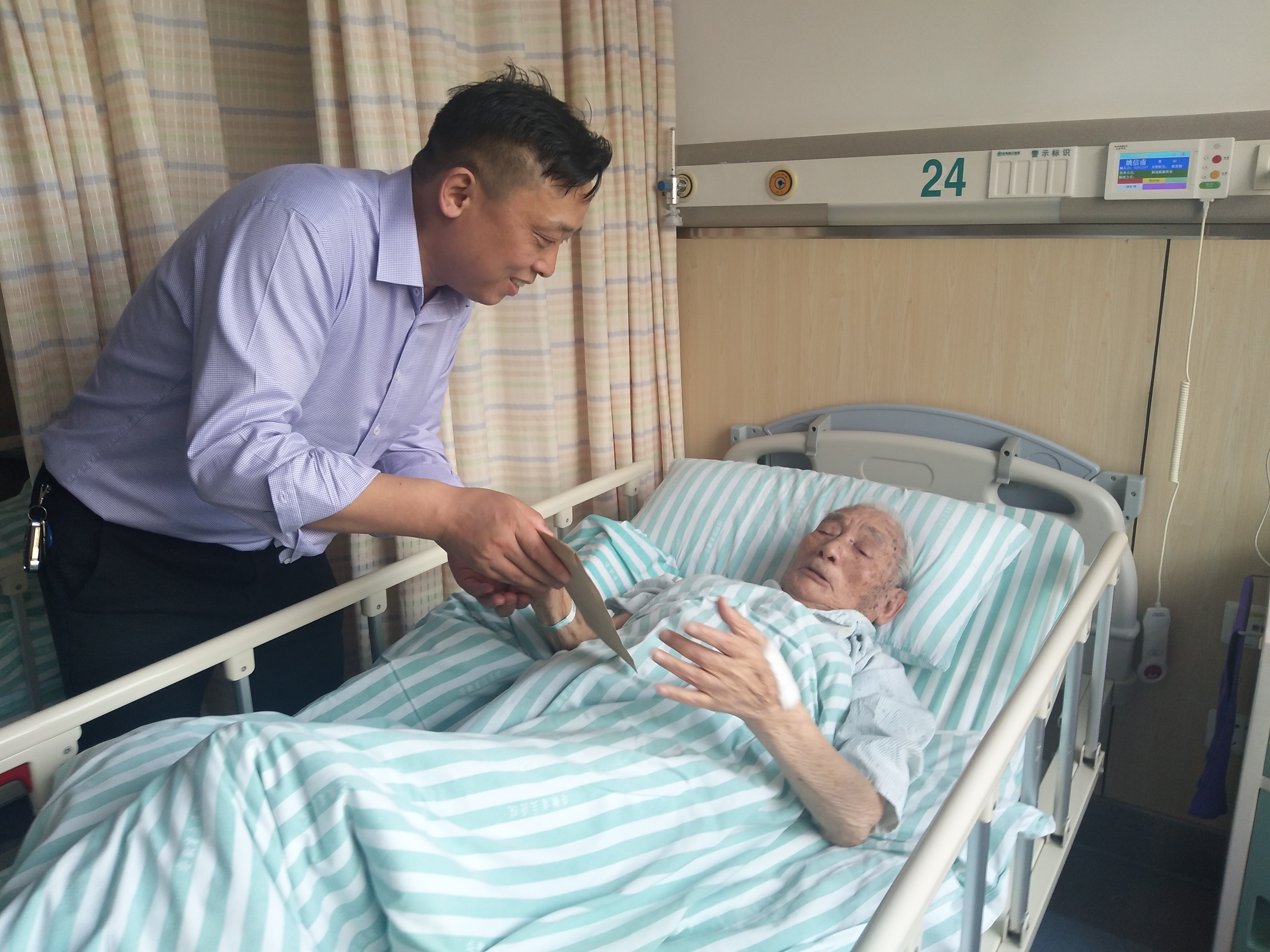 姚老今年93歲,1945年10月參加革命,戎馬生涯大半輩,為革命立過戰(zhàn)功,受過傷,在二建公司生產(chǎn)建設(shè)中做過突出貢獻(xiàn)。仇多維代表公司向姚老表示慰問并送上壹仟元慰問金,感謝姚老多年來一直對公司改革發(fā)展的關(guān)心和支持,希望姚老身體早日康復(fù)、幸福快樂的生活。仇多維再三叮囑離休辦的同志一定要高度關(guān)心愛護(hù)離休干部“政治、生活兩個(gè)待遇”落實(shí)問題,為離休老干部提供良好的服務(wù)保障工作。