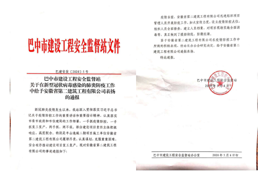2020年5月6日,四川巴中市安全監督站對安徽二建承建的半山逸城二期項目在新冠肺炎防疫疫情防控和有序復工復產工作進行通報表揚。