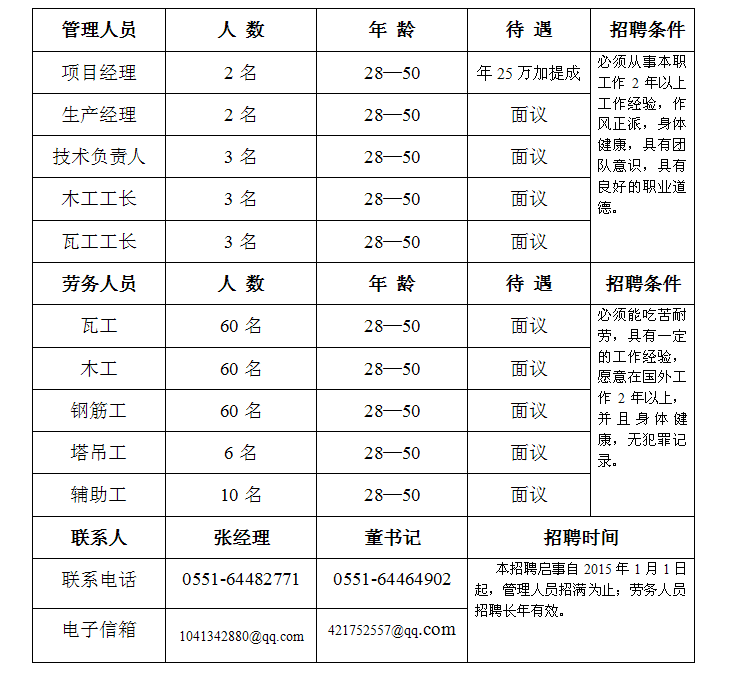 因安徽省第二建筑工程公司承建的阿爾及利亞阿爾及爾654套住房項目及太把薩大學城工程項目的需要,現公開面向社會招聘項目管理人員及勞務工人,具體招聘事項見附表。