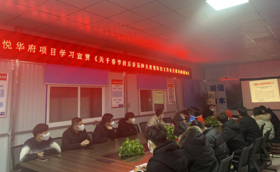 近日,銅陵吾悅華府項目組織學習【關于切實做好2021年“兩節”期間新冠肺炎疫情防控工作的通知】和【關于春節前后新冠肺炎疫情防控工作有關要求的通知】,根據文件精神安排部署春節前后新冠肺炎疫情防控工作,做到早安排早準備,確保本項目在春節前后無疫情發生。