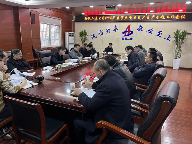2月16日下午,安徽二建公司在一樓會議室召開了節后項目復工復產專題工作會議。公司總經理李建成、財務總監王干出席會議,會議由副總經理葉和永主持。公司工程管理部、法務部(債權回收辦)、財務資產部、物資設備部、成本合約部、安全管理部、技術質量部負責人、所屬各單位經理、生產副經理參會。