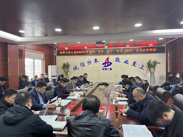 春潮涌動,新意盎然。3 月7日下午,安徽二建公司在一樓會議室召開了2022年3月安全、質量、生產、決算、債權、法務工作例會。公司總經理李建成、副總經理費勤波出席會議,公司相關部門負責人、所屬各單位經理、分管領導及工管、安全科長參加會議,副總經理葉和永主持會議。