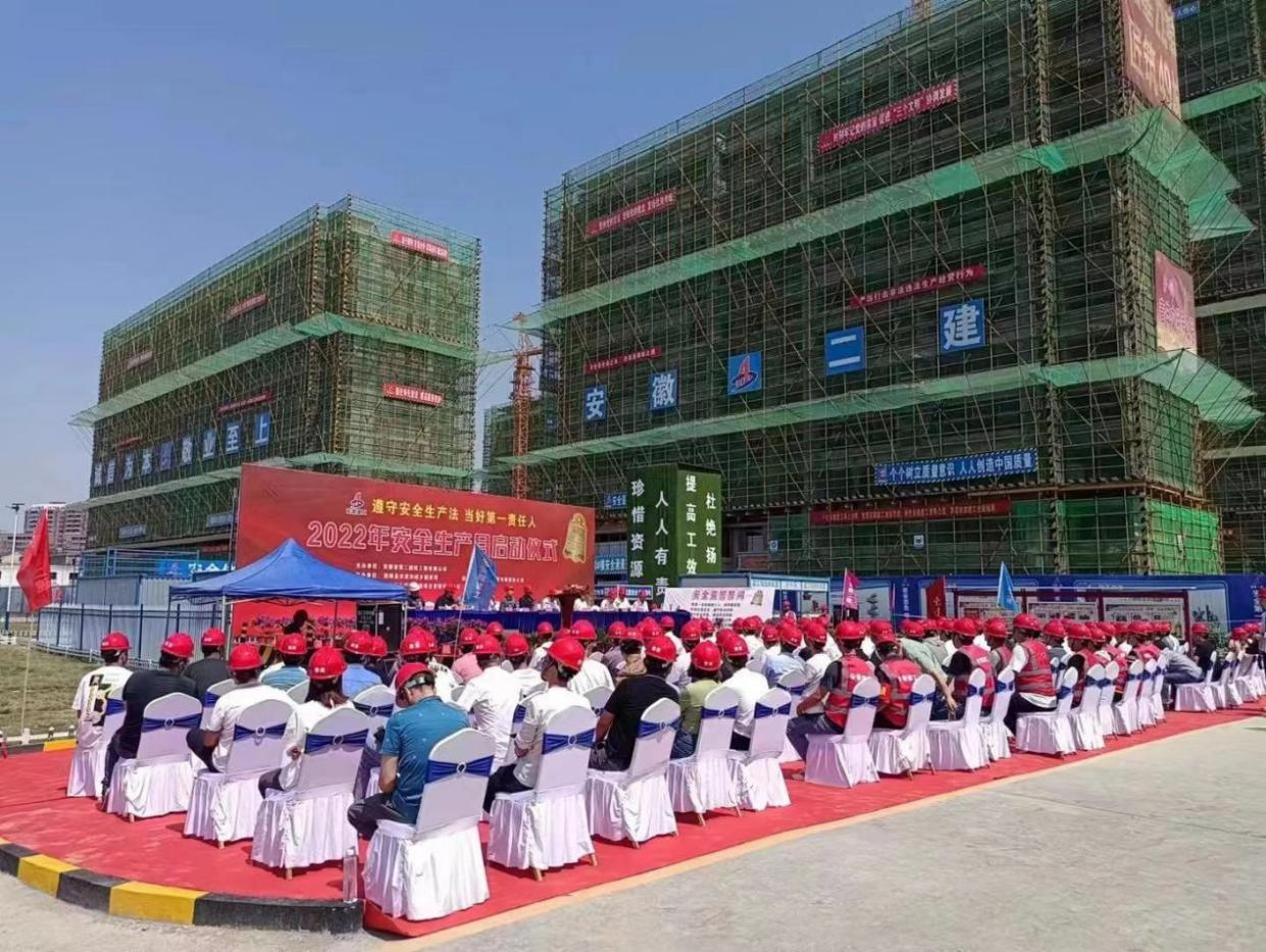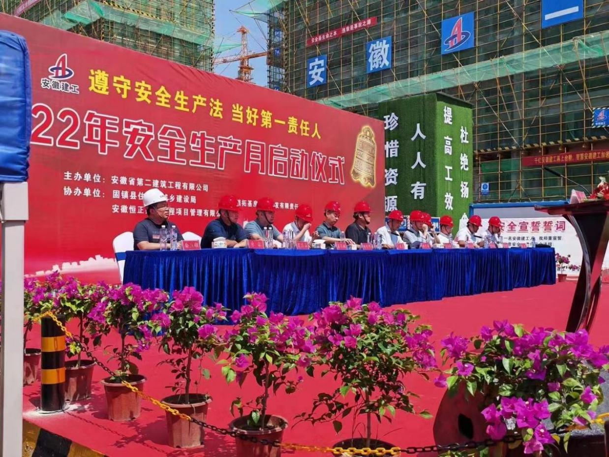 6月18日,安徽二建在固鎮(zhèn)鼎元名邸項(xiàng)目、蚌埠紫金云城項(xiàng)目舉辦2022年安全生產(chǎn)月活動(dòng)啟動(dòng)儀式暨現(xiàn)場觀摩交流活動(dòng)。固鎮(zhèn)縣住房和城鄉(xiāng)建設(shè)局局長劉安、應(yīng)急管理局局長宋洪濤等主管單位代表,蚌埠拓基房地產(chǎn)開發(fā)有限責(zé)任公司總經(jīng)理何世華等業(yè)主方代表,安徽二建公司黨委副書記、總經(jīng)理李建成,副總經(jīng)理葉和永,副總經(jīng)理、總工程師費(fèi)勤波等參加活動(dòng),活動(dòng)由葉和永主持。
