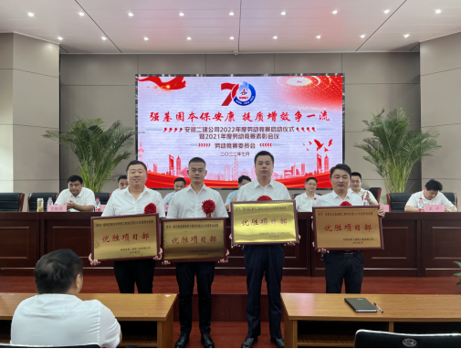 啟動(dòng)儀式上,公司黨委委員、副總經(jīng)理葉和永通報(bào)了2021年度“學(xué)黨史、保安康、搶工期、爭一流”勞動(dòng)競賽考核結(jié)果及表彰的決定。會(huì)議表彰了2021年度勞動(dòng)競賽優(yōu)勝單位、優(yōu)勝項(xiàng)目部。第三分公司、第四分公司等2家被授予“2021年度勞動(dòng)競賽優(yōu)勝單位”稱號(hào),宿州應(yīng)用技術(shù)學(xué)校、亳州濱江壹號(hào)、淮北鉑悅府、阜陽沃達(dá)星海城項(xiàng)目等4個(gè)項(xiàng)目被授予“2021年度勞動(dòng)競賽優(yōu)勝項(xiàng)目部”稱號(hào)。