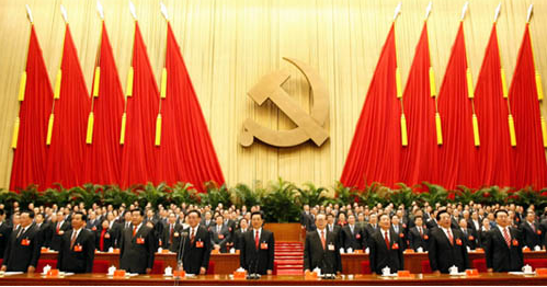 雄偉的人民大會堂大禮堂,氣氛隆重熱烈。主席臺上方懸掛著“中國共產黨第十七次全國代表大會”的會標,后幕正中是鐮刀和錘頭組成的黨徽,10面鮮艷的紅旗分列兩側。二樓和三樓的眺臺上分別懸掛著“高舉中國特色社會主義偉大旗幟,以鄧小平理論和‘三個代表’重要思想為指導,深入貫徹落實科學發展觀,為奪取全面建設小康社會新勝利而奮斗!”“偉大、光榮、正確的中國共產黨萬歲!”的橫幅。